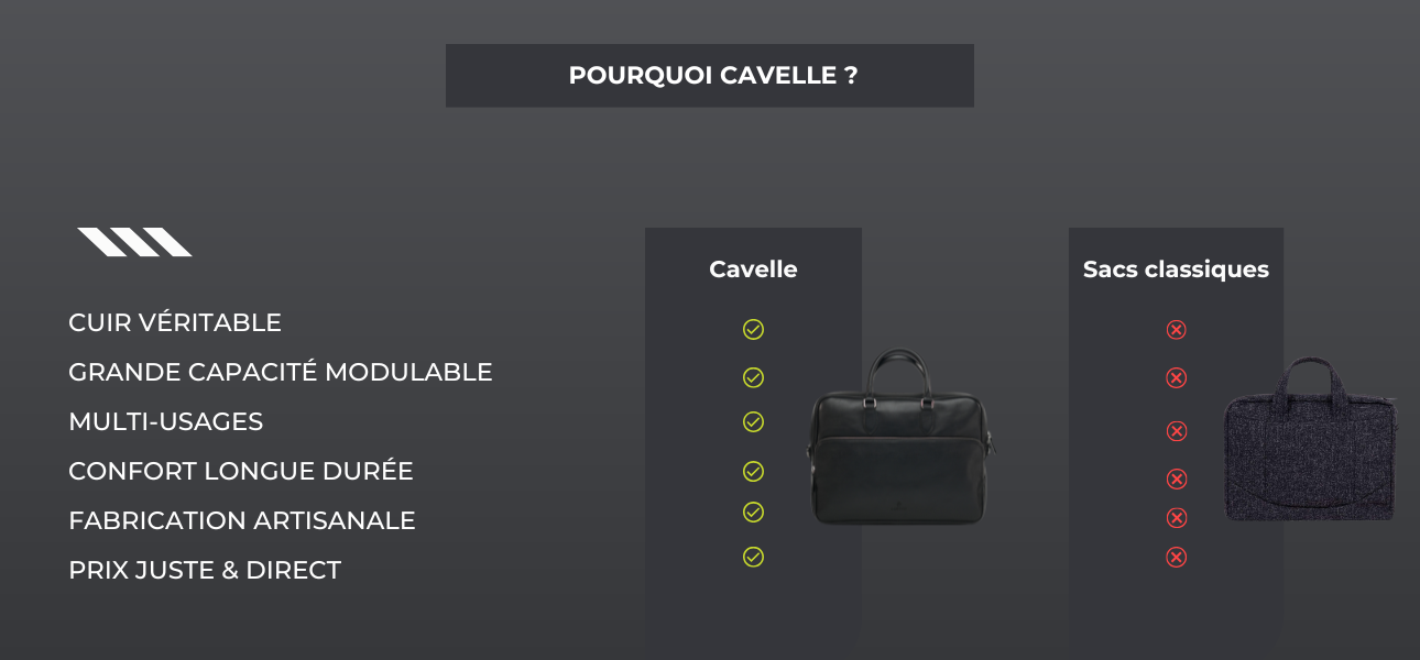 Chez Cavelle, nous ne créons pas seulement des sacs, mais des compagnons de route qui portent vos moments les plus précieux. Conçus en cuir véritable, ils vous suivent fidèlement à chaque étape — que ce soit dans l’effervescence du bureau, la quiétude d’un voyage ou l’intensité d’une journée bien remplie.